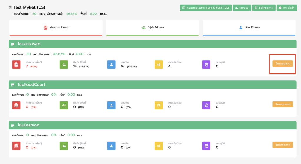 1. กดคลิก “จัดการตลาด” บริเวณโซนหรือตลาดที่ต้องการนำเข้าข้อมูลราคารายการบิลรายเดือนผ่าน Excel