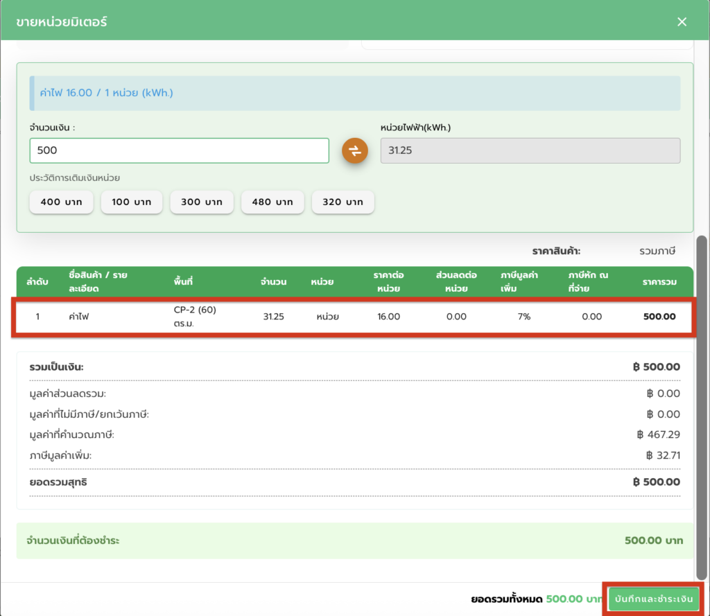 6. ระบบจะแสดงรายละเอียดและยอดชำระเงินขึ้นมาให้ตรวจสอบ หากถูกต้องให้กดคลิกปุ่ม “บันทึกและรับชำระเงิน“