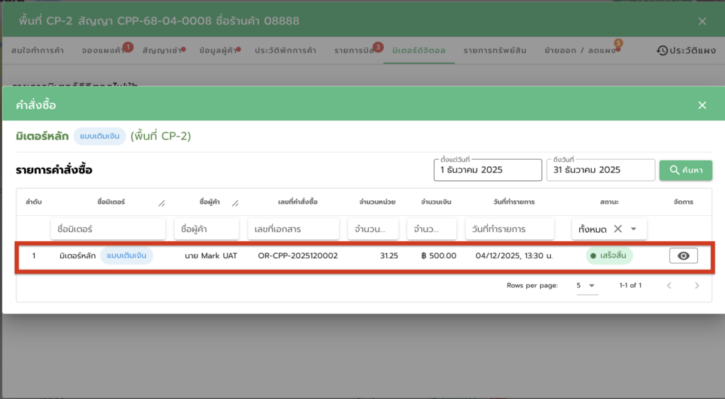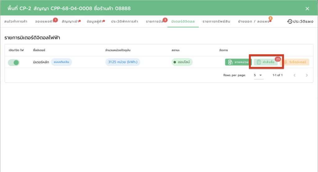 1. กดคลิกปุ่ม “คำสั่งซื้อ” กรณีที่ต้องการตรวจสอบคำสั่งซื้อหน่วยมิเตอร์ย้อนหลัง