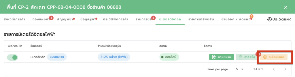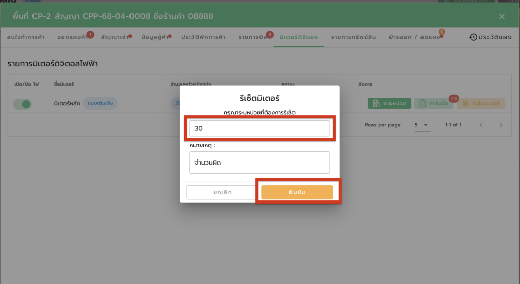 2. ระบุหน่วยมิเตอร์ที่ต้องการจะรีเซ็ต หลังจากนั้นกดยืนยัน